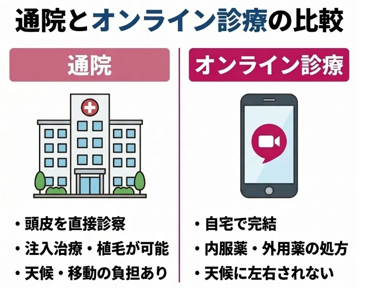 逆に、基本はオンラインで受診したい方でも、抜け毛の増え方が気になったときや治療内容を見直したいときには対面で相談できると安心です。天候や仕事の都合で通院しづらい時期があっても、診療スタイルを柔軟に切り替えやすいクリニックなら治療を続けやすくなるでしょう。