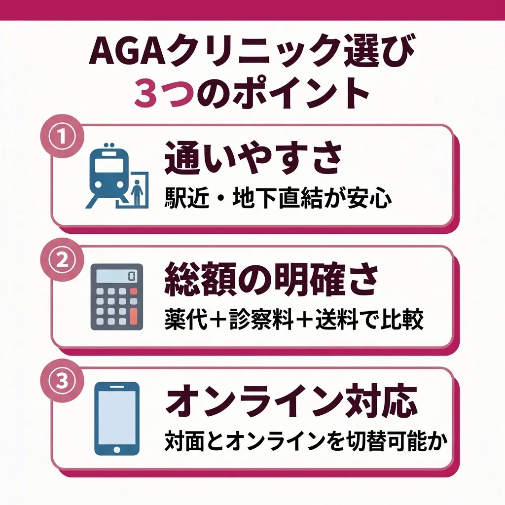 札幌でAGAクリニックを選ぶときは、料金だけでなく、通いやすさや診療の受けやすさなども合わせて確認するのが大切です。