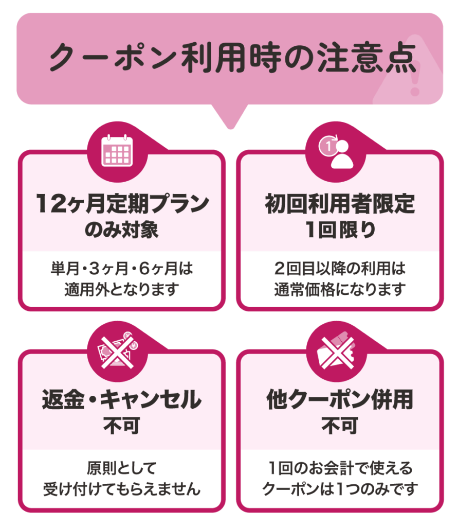 「まずは1ヶ月試してから…」と慎重になる気持ちもわかりますが、クーポンの恩恵を受けるためには「12ヶ月分まとめ買い」の決断が必要です。