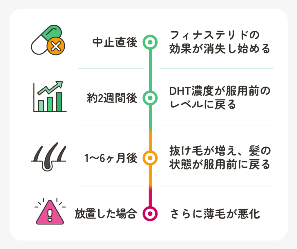 フィナステリドをやめると、遅くとも2週間後にはDHTの濃度が服用前のレベルに戻り、毛包の萎縮が起こりやすい状態になります。