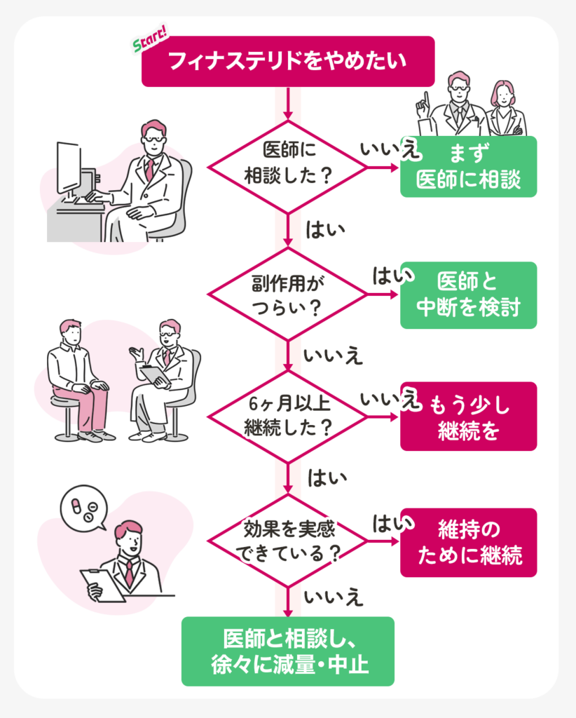 フィナステリドを始めるときもやめるときも、医師に相談してからにしましょう。